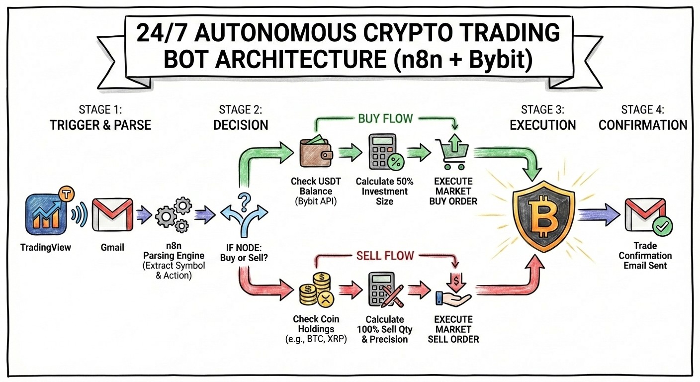 Here is a deep dive into how I used n8n to build a fully autonomous trading bot that executes trades instantly based on email alerts, handling everything from signal parsing to complex risk management on the Bybit exchange.
